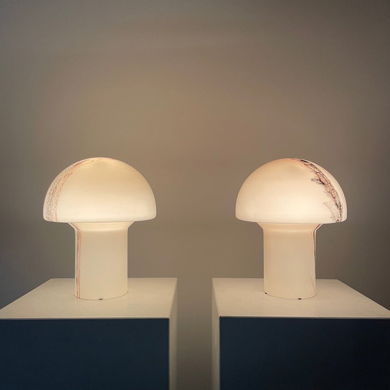 Magnifique paire de lampes de table à champignon en verre brun du célèbre fabricant allemand de luminaires Peill & Putzler, datant des années 1970. Ces lampes appartiennent à la série LIDO, également connue sous le nom de modèle CIRRUS, et sont assez rares, en particulier une paire dans cet état. Avec leur motif rayé et éclaboussé de peinture noire et rouge, chaque lampe est unique. Les lampes sont toutes deux marquées d'un autocollant. DIMENSIONS Hauteur : 28cm Diamètre : 21cm Longueur du cordon (avec prise EU) : 140cm