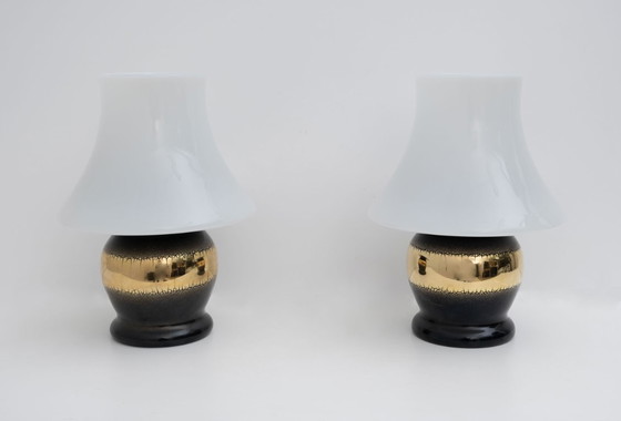 Les lampes sont façonnées à partir d'une seule pièce de verre soufflé, et leur base noire est recouverte de feuilles d'or 24 carats.