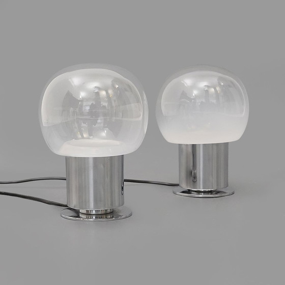 Paire de lampes de table de fabrication italienne produites dans les années 1970. Corps de lampe en métal chromé. Diffuseurs en verre teinté. Equipées d'une ampoule E27. Excellent état général, les deux lampes ont des hauteurs légèrement différentes et les deux diffuseurs en verre ont des teintes légèrement différentes. Dimensions : Diamètre 15 cm - Hauteur 22 cm : Diamètre 15 cm - Hauteur 22 cm REF L0770