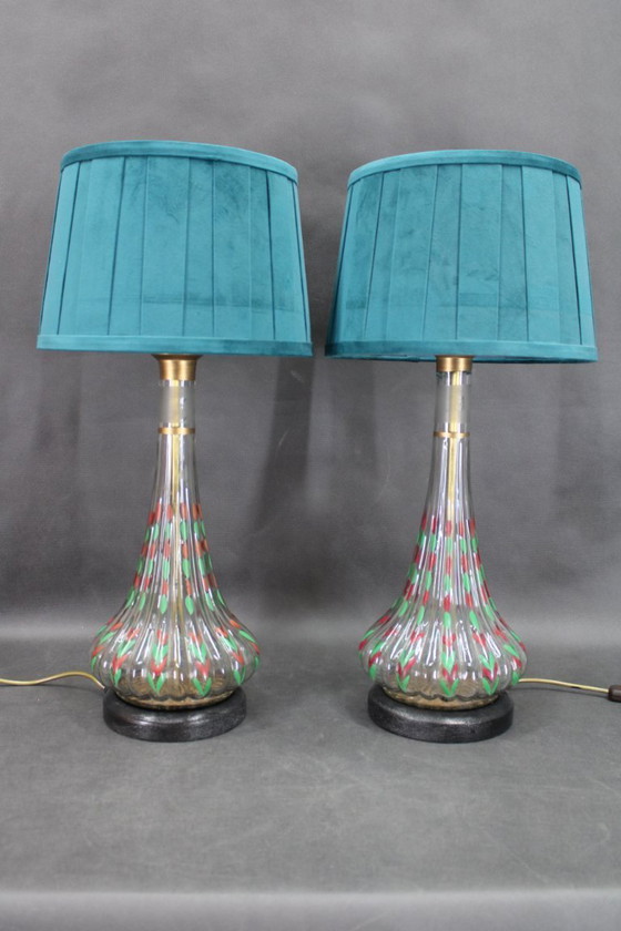 Paire de lampes de table en verre peintes à la main avec abat-jour en tissu neuf, Tchécoslovaquie, années 1960