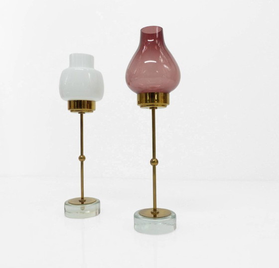 Élégante paire de bougeoirs/photophores du designer Gunnar Ander pour Ystad Metall, composée de montures en laiton doré, bases en verre épais et verreries colorées : une lanterne en verre violet et une en verre blanc opalin.