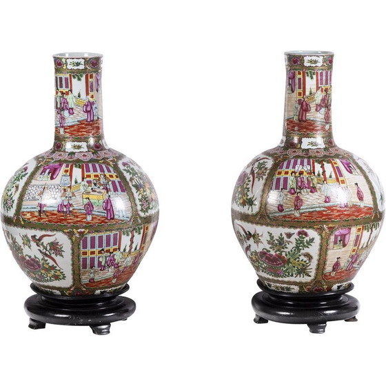 Paire de grands vases, ou potiches, en porcelaine de Canton, à décor polychrome de scènes de cour ou de scènes palatines, avec des personnages en costume traditionnel, des oiseaux et des fleurs.