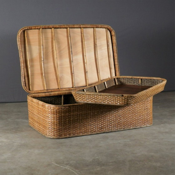 Quel bijou vintage ! Ce grand panier en rotin offre un grand espace de rangement et, grâce à ses dimensions exceptionnellement généreuses, peut également servir de table basse. Son couvercle dissimule un plateau supplémentaire.