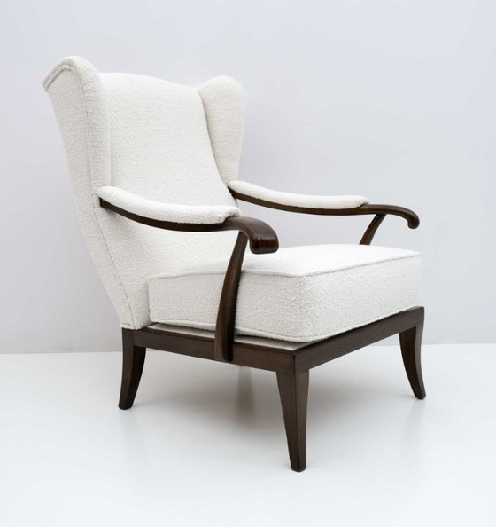 Italian mid-century armchair in light ivory Boucle fabric and walnut wood. Designed by Paolo Buffa in the 1950s. Perfect condition. Fabric and padding redone. Total restoration.