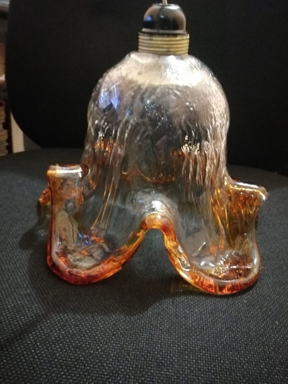 Suspension ou abat-jour, authentique pièce vintage italienne des années 1950/1960 (style Mid-Century Modern). Fabriquée en verre soufflé artistique de haute qualité (fabrication de Murano/verrier d'Empoli ?). Couleur ambre/cognac. Design : Forme de tulipe ou de fleur avec un bord ondulé caractéristique, travaillé à la main. Qualité : Verre soufflé robuste, d'environ 0,3 cm d'épaisseur, fabrication artisanale. Dimensions : Diamètre : environ 24 cm ; Hauteur : environ 20 cm ; Diamètre du trou de fixation : 45 mm. Le verre est intact, propre et sans ébréchure ni fissure. De petites bulles d'air peuvent être présentes, signe d'un soufflage artisanal authentique.