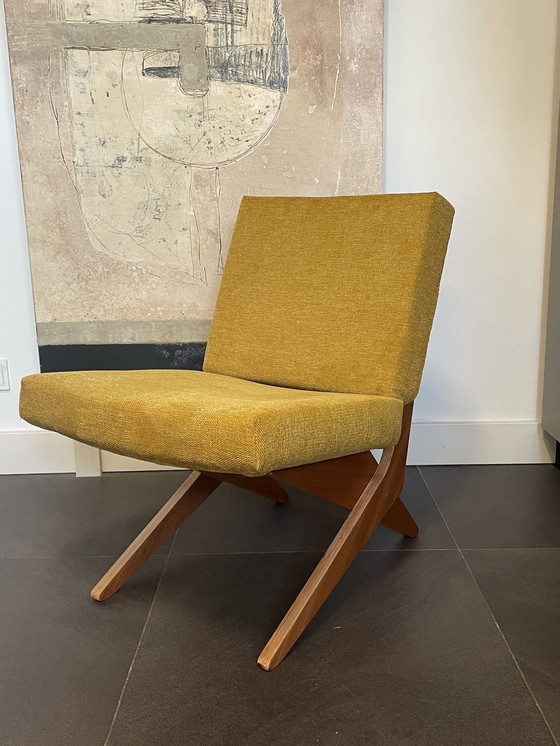 Cette chaise "Scissor" très rare a été conçue par l'architecte néerlandais Jan van Grunsven en 1959 et produite par UMS/Pastoe à Utrecht. Van Grunsven a travaillé pour le cabinet d'architecture Gerrit Rietveld dans les années 1950-60. Il n'a conçu que quelques meubles. Ce modèle bas moderniste s'appelle FB 18 et fait partie de la série "Combex" de Pastoe. La structure de la chaise est faite de couches stratifiées de contreplaqué.