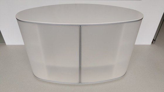 Ce meuble blanc (RAL 9001) est d'occasion mais en parfait état. Ses dimensions extérieures, de forme ovale, sont de 136 x 74 cm. Sa hauteur est de 84 cm.