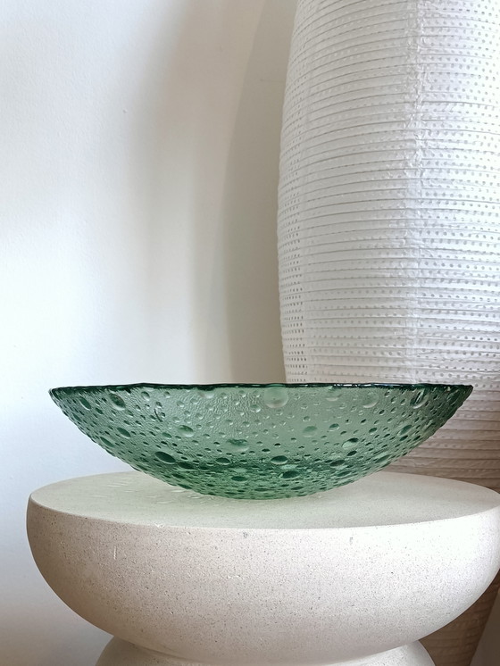 Magnifique bol transparent vert glacé avec un décor de gouttes qui semblent reposer sur la surface du bol. Ce bol a été conçu dans les années 1980 par Pavel Panek pour la verrerie Libochoviche de Sklo Union.