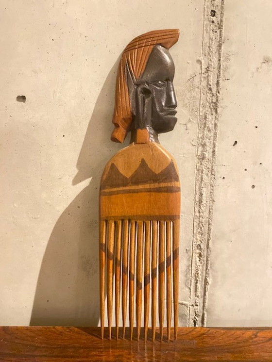 Peigne cérémoniel authentique d'Afrique de l'Ouest, sculpté à la main dans du bois et peint selon la tradition dans des tons naturels (ocre, rouge et noir). Ce type de peigne était un symbole de statut social et d'identité, souvent porté lors de rituels ou d'occasions sociales, et non comme un outil du quotidien.