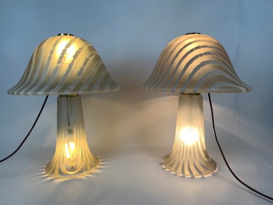 Cette lampe de table champignon de Peill & Putzler est un exemple étonnant de design moderne du milieu du siècle dernier. Avec sa forme unique de champignon, la lampe est fabriquée en verre de haute qualité avec un magnifique motif rayé crème et blanc. Les accents métalliques ajoutent une touche d'élégance, ce qui en fait un complément parfait à tout intérieur élégant. Son design intemporel et son excellente qualité de fabrication en feront une pièce précieuse de votre intérieur.