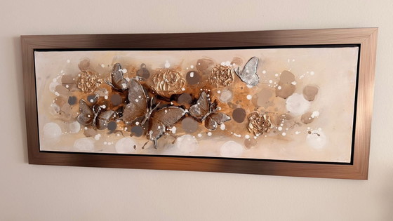 Il s'agit d'une toile peinte à la main, aux détails en 3D, dans un style abstrait et moderne. L'œuvre représente de nombreux papillons aux tons argentés et dorés métallisés, se détachant sur un fond de pois abstraits bruns, beiges et blancs, agrémenté d'éléments texturés.