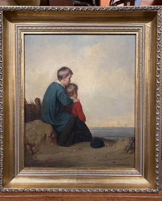 Huile sur panneau de bois, non signée, représentant deux enfants contemplant la mer. Encadrée d'un cadre doré moderne, cette œuvre provient d'une collection privée. Ses dimensions, cadre compris, sont de 41 x 4 x 46,5 cm (hauteur).