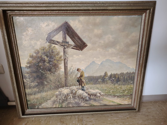 Cette impressionnante huile sur toile signée Lorenz Lehner (1895-1985, Viechtach, Basse-Bavière) vous transportera dans les paysages pittoresques de Bavière. Avec une précision magistrale, l'artiste capture une scène à la fois sereine et grandiose. Un berger et son troupeau se tiennent au premier plan, tandis que de majestueuses montagnes s'élèvent en arrière-plan. La finesse des détails et l'harmonie des couleurs font de cette œuvre un véritable enchantement artistique.