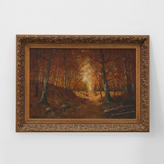 Captivante huile sur toile française du début du XXe siècle, signée et datée de Paris en 1926. Ce paysage à la composition harmonieuse capture la douce lueur d'une forêt d'automne, où la lumière filtre délicatement à travers les arbres aux riches tons ambrés et roux.