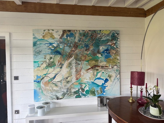 - Réalisée sur une toile de haute qualité, cette œuvre révèle un jeu magistral de nuances de bleu, de vert, de brun et de blanc.