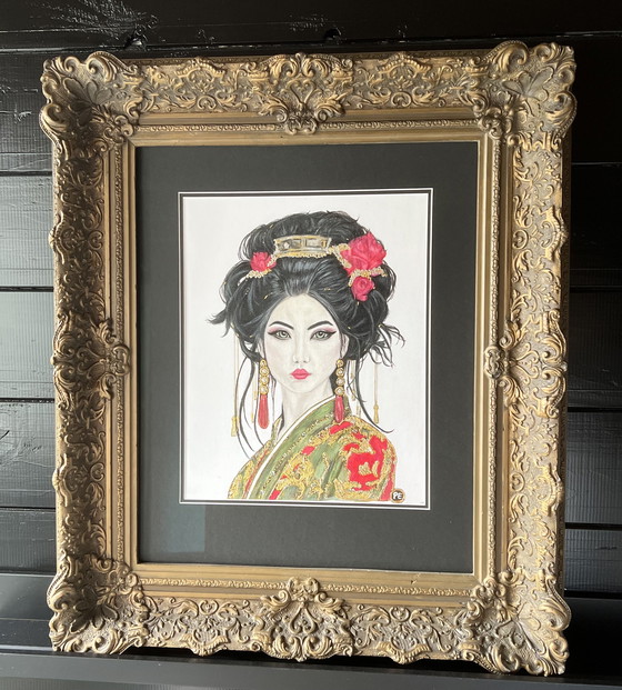 Peinture de geisha crayon/acrylique cadre baroque ancien