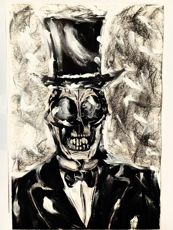 Plongez dans l'univers mystérieux de Moszkowicz avec cette captivante toile, « Baron Samedi ». Cette œuvre offre une représentation saisissante de la figure emblématique du vaudou haïtien, reconnaissable à son chapeau haut-de-forme et à son visage squelettique. La palette monochrome de noir, blanc et gris lui confère une dimension dramatique, en faisant un sujet de conversation idéal pour n'importe quelle pièce.