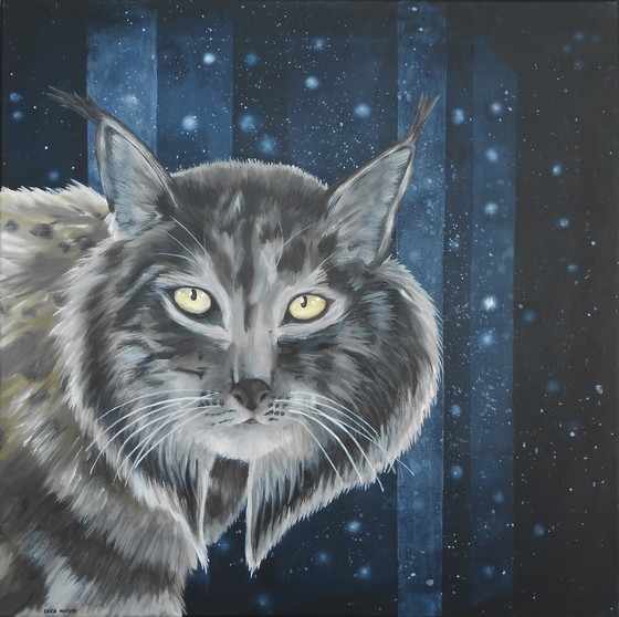 Ce magnifique Lynx a été peint par Erica Muizer en 2014. Erica Muizer est une artiste de Spijkenisse, aux Pays-Bas. Elle a été formée à l'école Willem de Kooning à Rotterdam. Elle réalise de nombreuses peintures sur toile ou sur papier en utilisant de l'acrylique, de l'eau et de la peinture à l'huile. Elle aime alterner les styles et les techniques.