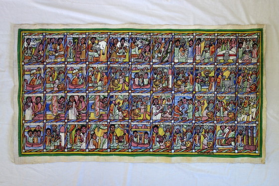 Peinture éthiopienne naïve à l'huile sur toile représentant l'histoire biblique traditionnelle de la Reine de Saba et du Roi Salomon. Elle est composée de 44 petits panneaux, chacun racontant la célèbre histoire du point de vue du peintre éthiopien. Chaque panneau comporte également une description en amharique.