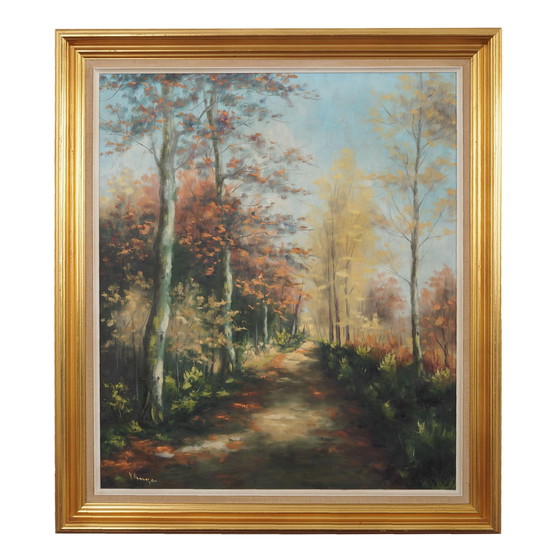 Le cadre est en bois. La peinture est maintenue dans des couleurs d'automne. La toile porte la signature de l'auteur dans le coin inférieur gauche. C'est un complément idéal à la décoration du salon, du couloir ou de la chambre d'enfant.