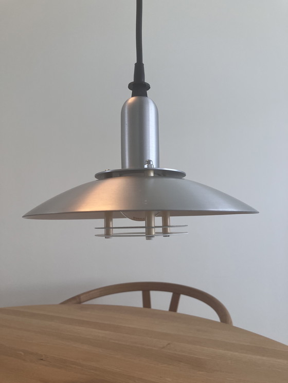 D'un diamètre d'environ 19 cm, cette suspension compacte est idéale au-dessus d'une petite table à manger, dans une cuisine, ou pour apporter une touche subtile à de petits espaces. Sa finition en aluminium brossé lui confère un style architectural intemporel qui s'harmonise aussi bien avec les intérieurs modernes que vintage.