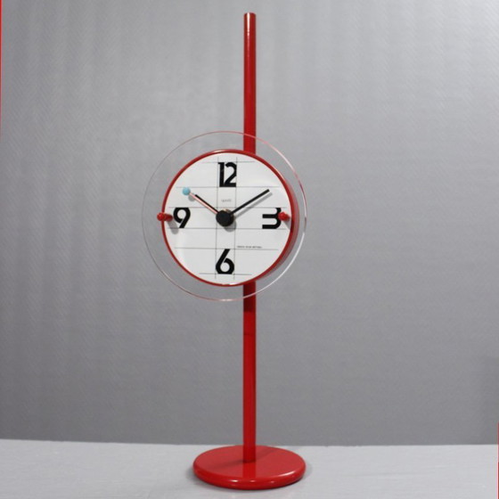 Belle pendule à poser vintage design Iriam Bettera circa 1980, composée d'une tige en métal laqué rouge sur lequel se fixe le corps de la pendule, réglable en hauteur.