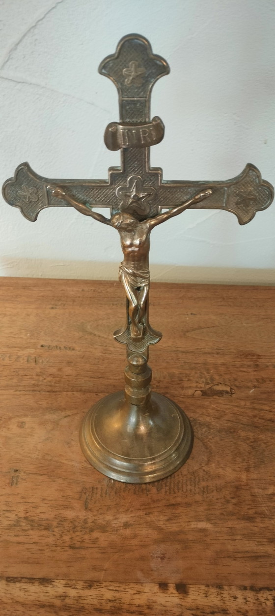 Ce magnifique crucifix en cuivre dégage une élégance intemporelle qui s'intègre parfaitement dans un intérieur classique. Minutieusement travaillé, il arbore une finition raffinée qui attire le regard.