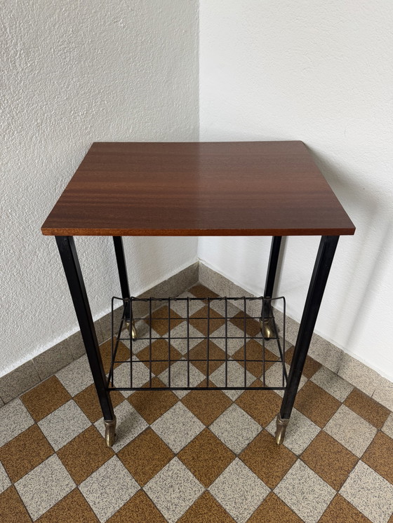 Petit porte vinyles années 60, tablette en teck et structure en métal noir sur roulettes, très bon état général (oxydation sur les roues: voir photos). Hauteur: 59cm. Largeur: 45cm. Profondeur: 35cm.