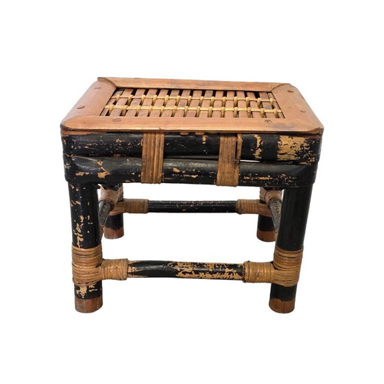 Cette petite table d'appoint vintage en bambou, d'origine asiatique et datant des années 1950/60, est un charmant meuble artisanal. La peinture noire est légèrement patinée, mais en bon état.