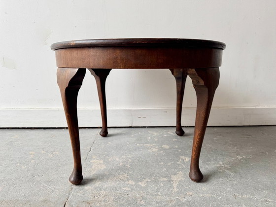 Table d'appoint ronde vintage datant de la période du programme de mobilier utilitaire britannique (Utility Furniture Scheme), produite pendant la Seconde Guerre mondiale (vers 1942-1952). Reposant sur d'élégants pieds cabriolets, elle apporte une touche classique subtile à un design par ailleurs sobre et fonctionnel.