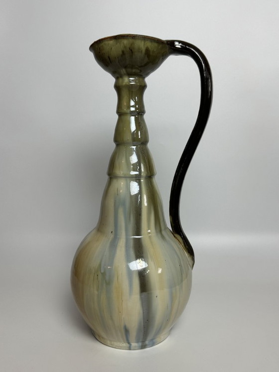 Vase/pichet vintage en céramique émaillée multicolore brillante, avec une élégante anse. Créé par Eugène Losson pour Bouffioulx dans les années 1960. Ce vase ou pichet expressif, signé Eugène Losson pour Bouffioulx, présente une forme sculpturale, une anse élégante et un visage modelé à la main. Sa finition est rehaussée d'un émail multicolore brillant et vibrant. Les couleurs fluides et le design ludique confèrent à cette pièce une forte présence artistique. Le vase est en excellent état vintage, avec des émaux magnifiquement harmonisés. Un bel objet qui s'intègre à tous les intérieurs éclectiques. Il est en parfait état. Un exemple remarquable de l'art céramique belge. Dimensions : Hauteur 45 cm, Diamètre supérieur 11 cm, Diamètre d'ouverture 3 cm