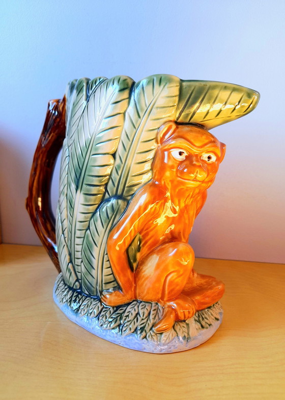 Ce pichet zoomorphe en barbotine, représentant un singe, est une pièce qui ajoutera une touche d'originalité à votre table. Fabriqué en céramique, il arbore des couleurs vives avec des nuances d'orange et de vert, évoquant une ambiance tropicale. Idéal pour les amateurs de pièces vintage, ce pichet est non seulement fonctionnel mais aussi décoratif. Parfait état