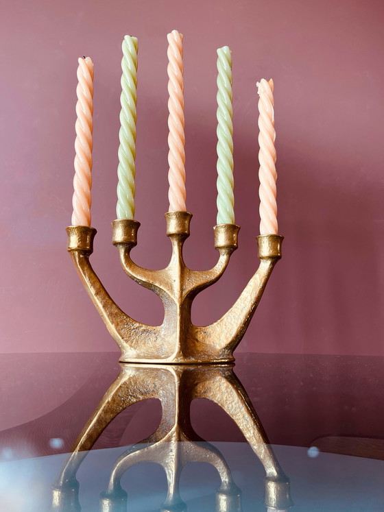 Une pièce maîtresse pour les amateurs de caractère et de savoir-faire. Ce lourd bougeoir vintage en laiton, signé Gilde Handwerk, se situe dans le haut de gamme et porte une étiquette « Allemagne » (années 1960/70). Sa forme sculpturale élégante, avec ses cinq bras, crée une ambiance chaleureuse et intemporelle.