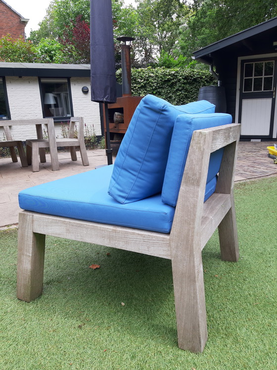 Le bois se décolore et devient gris, ce qui est inhérent à l'utilisation en extérieur. Selon vos préférences, un léger ponçage et un huilage/vernissage du bois peuvent restaurer la nouvelle couleur. Les coussins sont comme neufs. Ils ont été peu utilisés et ont toujours été rangés à l'intérieur. Les housses de coussin zippées sont amovibles et lavables. Petites fissures superficielles inévitables ici et là aux extrémités du bois.