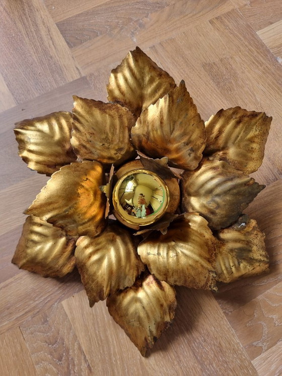 Ce magnifique plafonnier des années 1960 attire tous les regards avec ses feuilles en métal doré. Le design dégage un charme vintage qui s'intègre parfaitement dans les intérieurs classiques et modernes. La lampe est facile à monter au plafond et est en bon état de fonctionnement. Avec une hauteur de 14 cm et un diamètre de 42 cm, cette lampe offre un éclairage élégant dans n'importe quelle pièce.