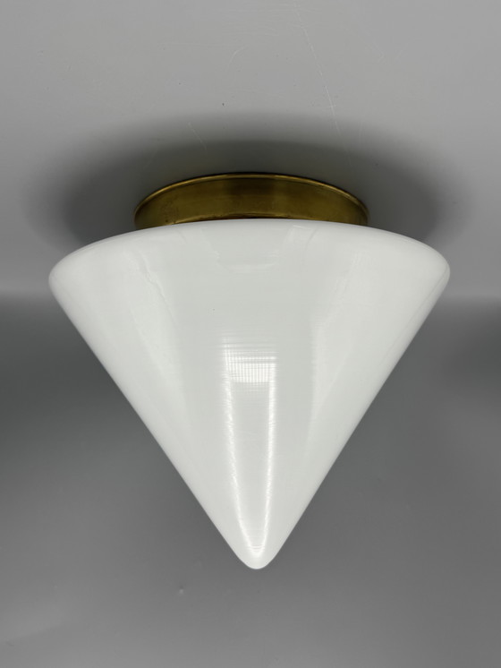 Ce plafonnier unique allie élégance et simplicité dans un design épuré. Son abat-jour conique en verre blanc diffuse une douce lumière diffuse, créant une ambiance chaleureuse et chaleureuse dans n'importe quelle pièce. La monture en laiton lui confère un aspect chaleureux et luxueux et crée un joli contraste avec le verre blanc.