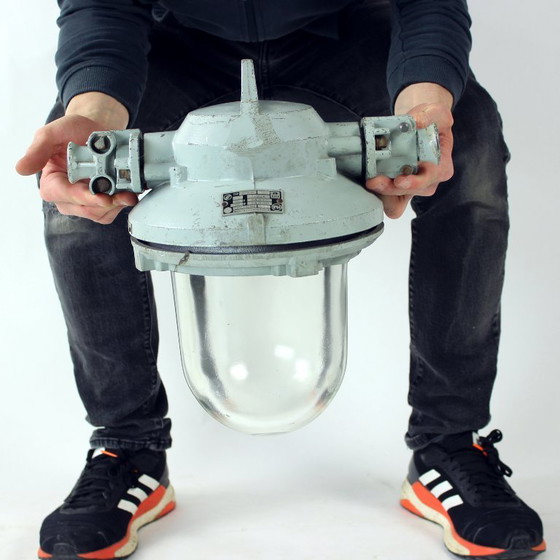 Il s'agit d'une belle trouvaille, car cette lampe combine l'élégance d'une lampe avec le charme industriel d'une lampe d'usine. Les étiquettes d'origine sont encore attachées. Cette lampe a une base en acier de couleur grise et un lourd bouclier en verre d'usine. Le verre est transparent et lourd. La lampe est entièrement restaurée avec de nouveaux composants électriques et est prête à être utilisée dans les maisons d'aujourd'hui. Fonctionne avec une ampoule E27. Facile à utiliser dans les maisons d'aujourd'hui. Belle et élégante lampe. Nous en avons trois de disponibles. Prix par lampe. Contactez-nous si vous souhaitez en acheter plus d'une.