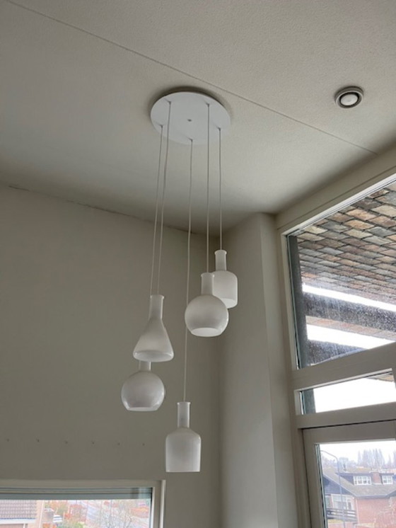 - Cinq abat-jour en verre uniques pour un effet ludique.