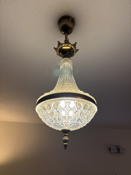 Illuminez votre espace avec ce superbe plafonnier vintage, véritable témoignage d'une élégance intemporelle et d'un savoir-faire raffiné. Son abat-jour en verre finement travaillé, associé à une finition en laiton sophistiquée, crée un point focal captivant qui sublime l'ambiance de n'importe quelle pièce.
