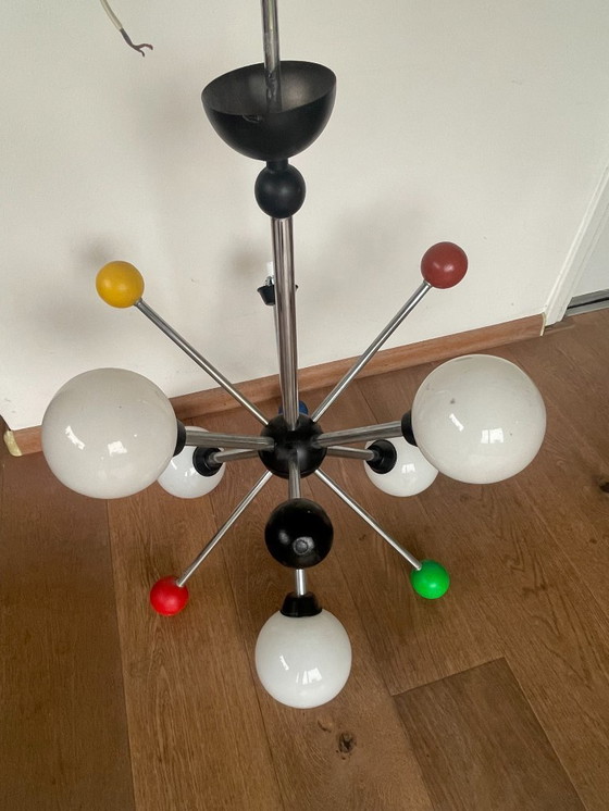 Une suspension design. L'association du blanc, du noir, du rouge, du vert, du bleu et du jaune crée un style dynamique qui s'intègre parfaitement à une décoration moderne.