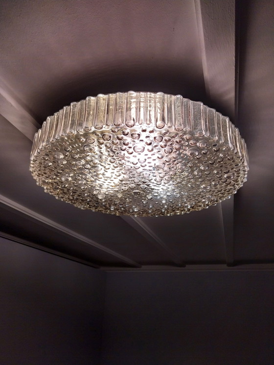 Magnifique plafonnier vintage de la marque allemande Staff Leuchten, datant des années 1960 et réalisé en verre bullé. Il diffuse une lumière douce et chaleureuse et attire tous les regards. Son design bas et rond le rend idéal pour un salon, un couloir, une chambre ou un bureau, et s'accorde parfaitement avec un intérieur de style moderne du milieu du siècle, rétro ou art déco. Fabriqué en verre massif, il est en bon état vintage, présentant de légères traces d'usure normales pour son âge.