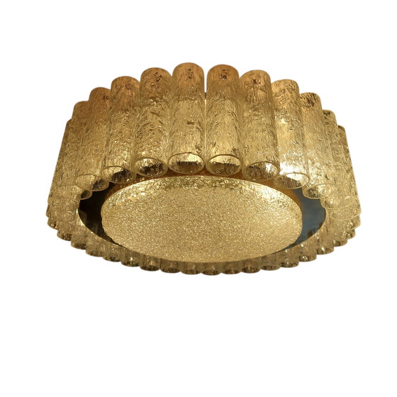 Magnifique plafonnier vintage de Doria Leuchten. Comprend 6 points lumineux, 32 tubes en verre tout autour et une plaque de recouvrement en verre en bas. Bordure ornée en laiton (coloré). Cette belle lampe a un diamètre d'environ 45 cm et une hauteur au plafond de 15 cm. L'ensemble est en bon état avec de (légères) traces d'utilisation.