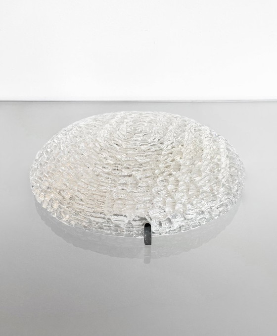 Plafonnier vintage des années 1970, fabriqué par Hustadt Leuchten en Allemagne. Son verre épais à bulles crée un magnifique effet lumineux. La partie en verre est en parfait état. La plaque arrière présente quelques éraflures (invisibles une fois le plafonnier installé). Étiquette de la marque d'origine présente.