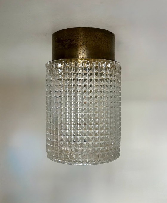 Plafonnier composé d’une structure en laiton massif patiné et d’un diffuseur en verre moulé pressé designer par Carl Fagerlund en Suède au début des années 60. Classique du design suédois au dessin intemporel, éclairage chaud et jeux de lumières, très belle patine du laiton. Ampoule E27, LED compatible, électricité vérifiée, prête à poser.