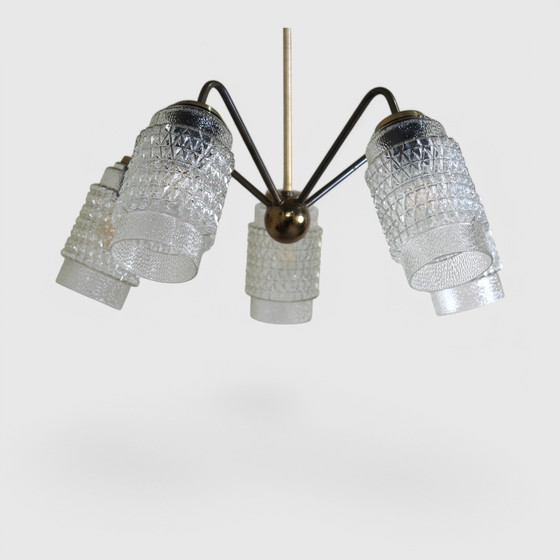 Magnifique lustre ou plafonnier vintage à cinq "bras" des années 1960/70. Le cadre est en laiton et les abat-jours en verre pressé gaufré. N'hésitez pas à venir le voir en vrai.