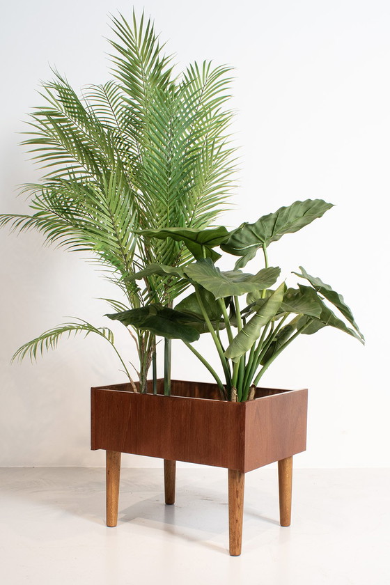 Jardinière danoise en placage de teck, sans pot intérieur. Les pieds sont en bois différent (probablement du chêne), ce qui laisse penser qu'ils ont été remplacés. En bon état vintage.