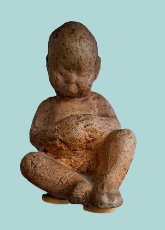 Petite sculpture représentant un garçon assis, moulée. Signée au revers.