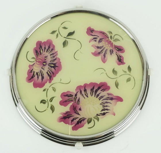 Très joli présentoir à gâteaux des années 1930. Bordure étagée en métal chromé avec 4 petits boutons rotatifs en plastique blanc. Pied en métal peint en jaune, plateau en verre décoré de motifs floraux sous verre.