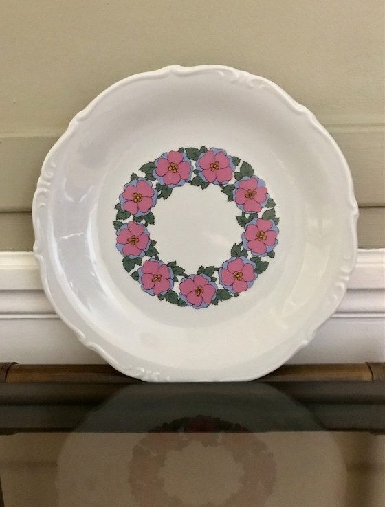 Plat de présentation en porcelaine allemande vintage: années 80. Winterling bavaria (depuis 1898). Décor fleurs roses en rosace. Jolies finitions sur le bord du plat. Qq micro traces d'usage. Diamètre 28 cm. Hauteur 3, 5 cm.