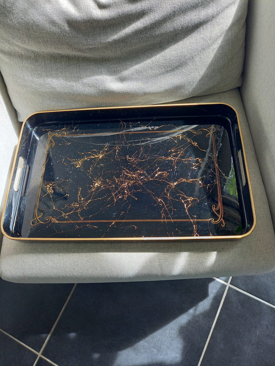 Ce plateau Art déco élégant de Melarti apporte une touche de sophistication à votre intérieur. Sa finition noire brillante et ses délicats détails dorés en font un bel exemple de style intemporel et de savoir-faire artisanal. Idéal pour servir des boissons ou comme objet décoratif sur une table basse. Sa structure métallique robuste lui confère durabilité et élégance. Intégrez cette pièce unique à votre décoration et appréciez le charme classique qu'elle apporte.